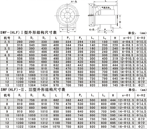 二.SWF(HLF)系列高效低噪聲混流式通風(fēng)機(jī)外形尺寸