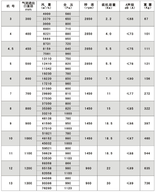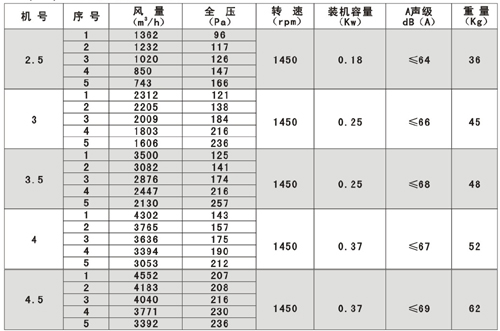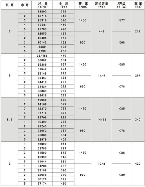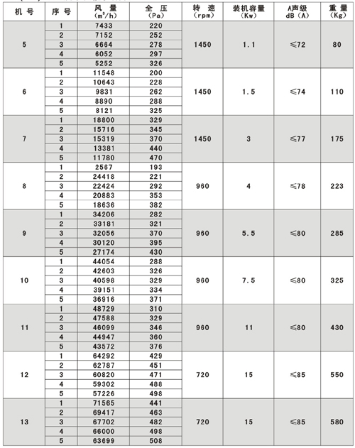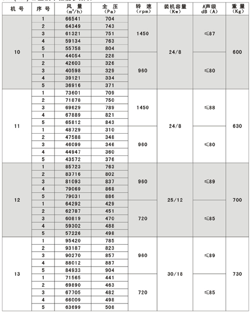 SWF(HLF)系列高效低噪聲混流式通風(fēng)機(jī)技術(shù)參數(shù)表