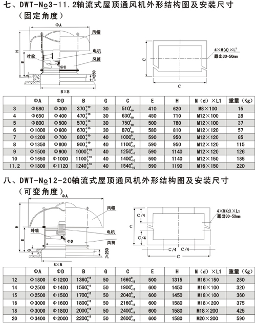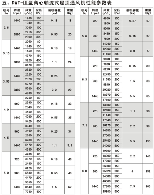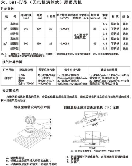 一、特點(diǎn) 1.型式規(guī)格多,應(yīng)用范圍廣:可根據(jù)使用場(chǎng)合的風(fēng)量,風(fēng)壓和噪聲的不同要求,選用以下型式的風(fēng)機(jī): (a)離心式屋頂通風(fēng)機(jī):DWT-III型,適用于風(fēng)量較小而壓力要求較高的場(chǎng)合; (b)無(wú)電機(jī)屋頂通風(fēng)機(jī):代號(hào)為DWT-IV型,適用于鋼結(jié)構(gòu)屋頂,是新世紀(jì)環(huán)保風(fēng)機(jī)首選產(chǎn)品。 2.效率高噪聲低本風(fēng)機(jī)系采用先進(jìn)的CAD系列軟件,經(jīng)多目標(biāo)優(yōu)化設(shè)計(jì)開(kāi)發(fā)。本系列風(fēng)機(jī)中1200.1400.1500.1600.2000.及2400mm風(fēng)機(jī)采用同值徑不同轉(zhuǎn)速,不同角度改變幾量.風(fēng)壓的方法,以滿足不同使用工況的需要,達(dá)到風(fēng)機(jī)與系統(tǒng)匹配,以利實(shí)現(xiàn)節(jié)能和降低噪聲; 3.質(zhì)輕。高強(qiáng)。耐腐蝕;風(fēng)機(jī)葉輪可根據(jù)工作空氣介質(zhì)不同的腐蝕性而采用不同的材質(zhì),分別有ABS(工程塑料)FRP(玻璃鋼)和鋁合金板材制作,對(duì)于壓力要求高,風(fēng)機(jī)轉(zhuǎn)速較大的離心風(fēng)機(jī),葉輪表面較特殊的鍍鋅加噴塑耐蝕處理,不僅降低整機(jī)重量且有良好的耐腐蝕能力; 4.運(yùn)轉(zhuǎn)平穩(wěn),壽命長(zhǎng);本風(fēng)機(jī)的轉(zhuǎn)動(dòng)慣量小,動(dòng)平衡精度高,運(yùn)轉(zhuǎn)平穩(wěn),各項(xiàng)性能指標(biāo)的工廠內(nèi)控標(biāo)準(zhǔn)要求均高于風(fēng)機(jī)待業(yè)標(biāo)準(zhǔn),能確保風(fēng)機(jī)長(zhǎng)期穩(wěn)定地運(yùn)行; 5.適用面廣:本風(fēng)機(jī)可以根據(jù)使用要求,制造成防爆型,阻燃型,適用于抗老化,抽送易燃易爆及有腐蝕性氣體的場(chǎng)合; 6.外型美觀:本風(fēng)機(jī)的風(fēng)帽部件采用玻璃鋼制作,外表采用進(jìn)口膠衣樹脂膜,曲面過(guò)渡柔和,美觀大方,實(shí)用性強(qiáng);也可根據(jù)用戶要求制成鋼風(fēng)帽經(jīng)鍍鋅噴塑(PVC)處理; 7.使用條件:介質(zhì)溫度不超過(guò)60攝氏度,氣體中不允許含有過(guò)量粘性物,含塵量小于100mg/m。對(duì)介質(zhì)溫度高的場(chǎng)合,我廠有高溫風(fēng)機(jī)技術(shù)可提供產(chǎn)品使用。 8.本產(chǎn)品經(jīng)浙江省產(chǎn)品技術(shù)監(jiān)督所檢測(cè)合格,檢測(cè)項(xiàng)目含阻燃,導(dǎo)電性能,防爆,抗風(fēng)性能等,由市產(chǎn)品技術(shù)監(jiān)督局監(jiān)制。二、型號(hào)結(jié)構(gòu)說(shuō)明 1.軸流式屋頂風(fēng)機(jī)直徑自300-2400mm,供十七種機(jī)號(hào),離心式屋頂風(fēng)機(jī)有300-1000mm九種機(jī)號(hào)。還可根據(jù)用戶需要提供其它機(jī)號(hào)的風(fēng)機(jī); 2.各種型號(hào)的風(fēng)機(jī)結(jié)構(gòu)可參閱總裝圖,它由葉輪,風(fēng)筒,風(fēng)帽,傳動(dòng)部件,活頁(yè)風(fēng)門,防鳥網(wǎng),安全網(wǎng)等部件組成;(以上配置,按用戶要求制作) 3.風(fēng)機(jī)傳動(dòng)形式:DWT-1型風(fēng)機(jī)直徑<_2200mm采用電機(jī)直聯(lián)傳動(dòng),2200mm以上風(fēng)機(jī)采用皮帶傳動(dòng)形式,也可根據(jù)客戶要求采用減速器傳動(dòng)形式,活頁(yè)風(fēng)門有重力式,電動(dòng)式和手動(dòng)式三種。 4.屋頂風(fēng)使用范圍廣且數(shù)量大,根據(jù)用途的需要結(jié)構(gòu)形式繁雜,本廠可按用戶不同的技術(shù)要求,進(jìn)行研制開(kāi)發(fā),并對(duì)外形結(jié)構(gòu)進(jìn)行改進(jìn)。![]() ![]()